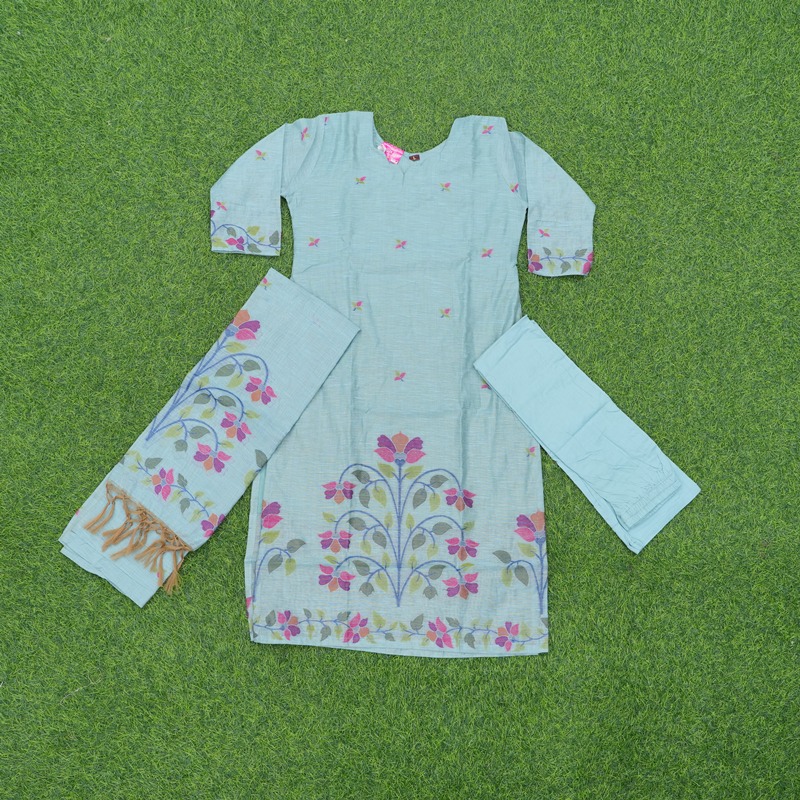 Blue Color Floral Jamdani Cotton Designer Dress