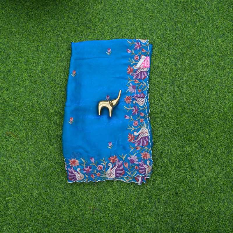 Chat to Buy Blue Tussar Silk Floral Embroidery Designer Work Saree