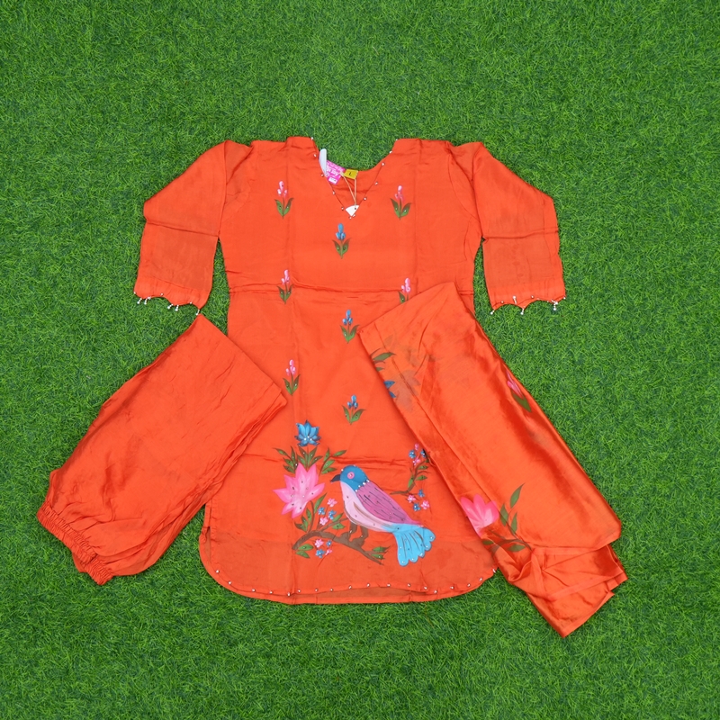Bright Orange Designer Dress with Bird Motif & Dupatta