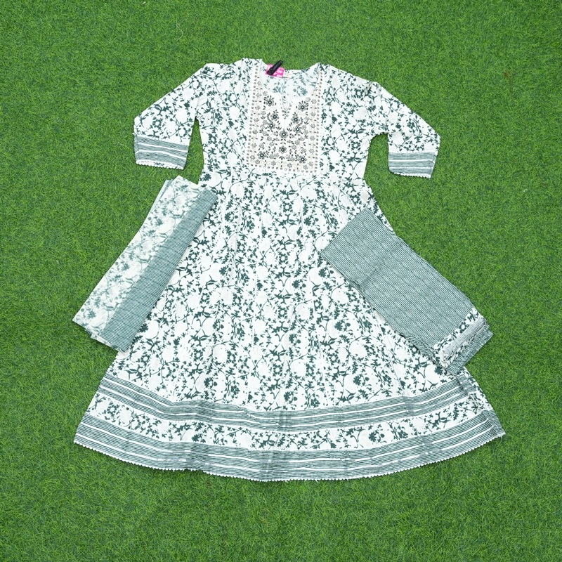 Cream and Green Cotton Blend Floral Printed Designer Dress