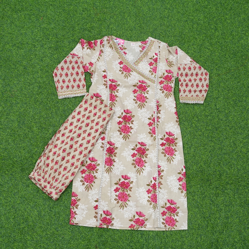 Daily Wear Beige Cotton Dress with Pink Floral Design