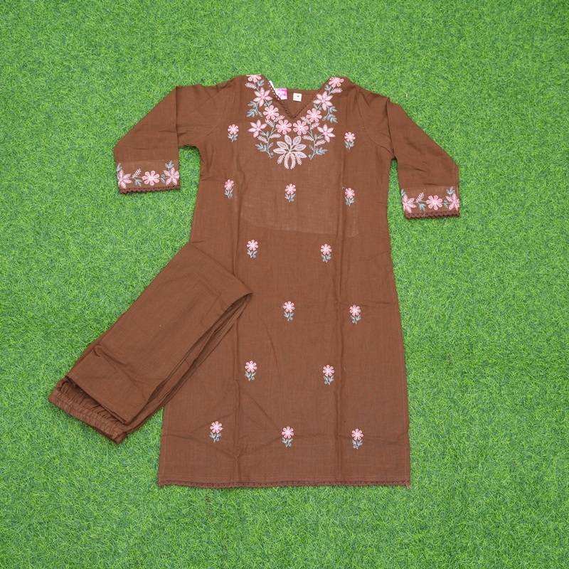 Daily Wear Brown Cotton Kurti Set with Floral Embroidery