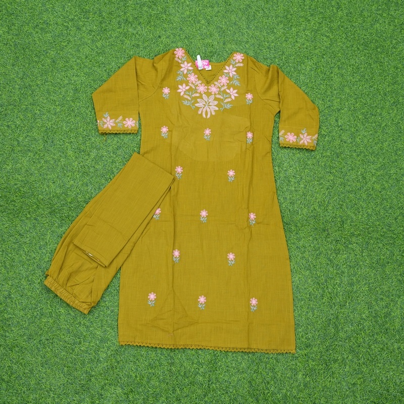 Daily Wear Green Cotton Kurti Set with Floral Embroidery