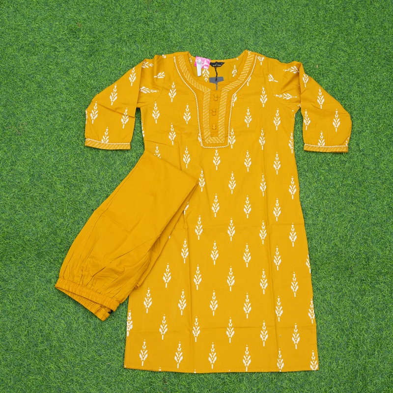 Daily Wear Mustard Yellow Cotton Dress with Floral Design