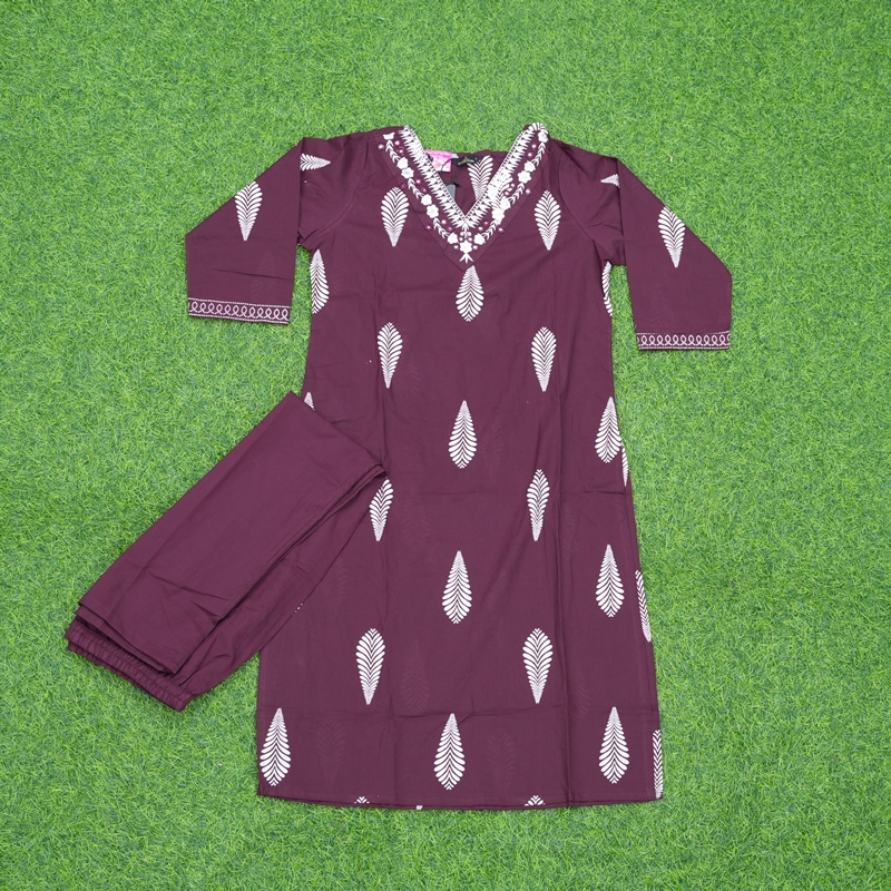 Daily Wear Wine Color Cotton Kurti Set with V-Neck Embroidery