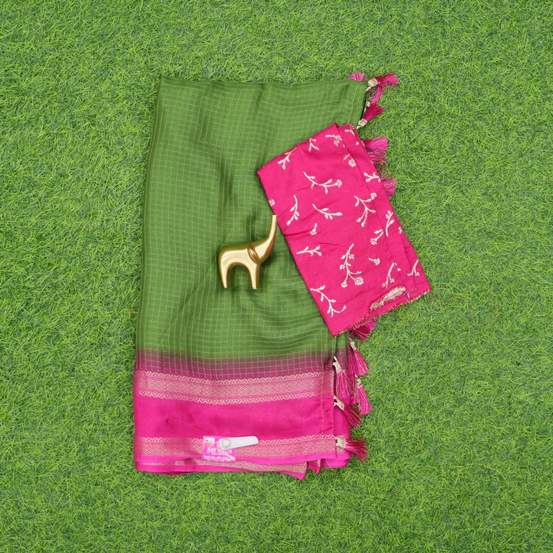 Chat to Buy Green and Pink Checked Saree With zari Border and Seperate Blouse Piece