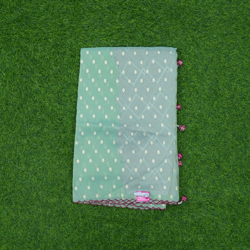 This saree is beautifully designed. The overall design of the saree is fantastic and adorned with a beautiful border, as shown. It comes with a matching designer blouse, which you can customise per your requirements.