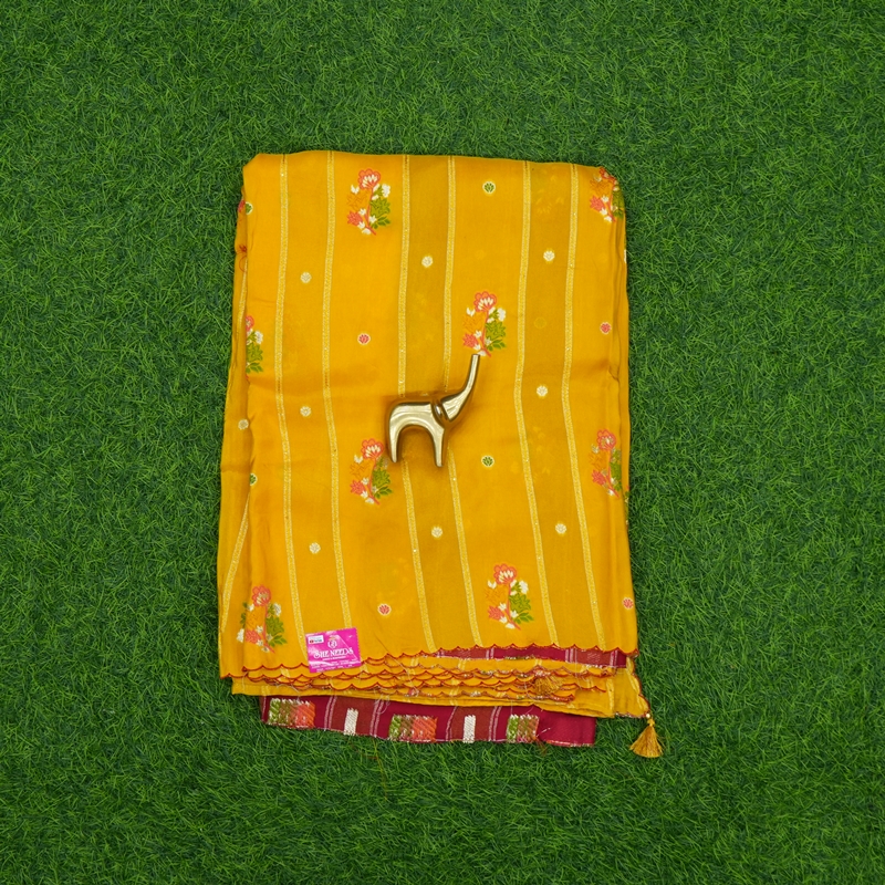 This saree is beautifully designed. The overall design of the saree is fantastic and adorned with a beautiful border, as shown. It comes with a matching designer blouse, which you can customise as per your requirements.