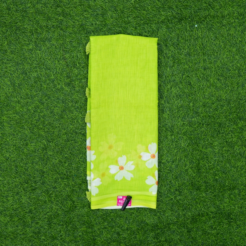 Parrot Green Color Floral Design Lenin Cotton Saree