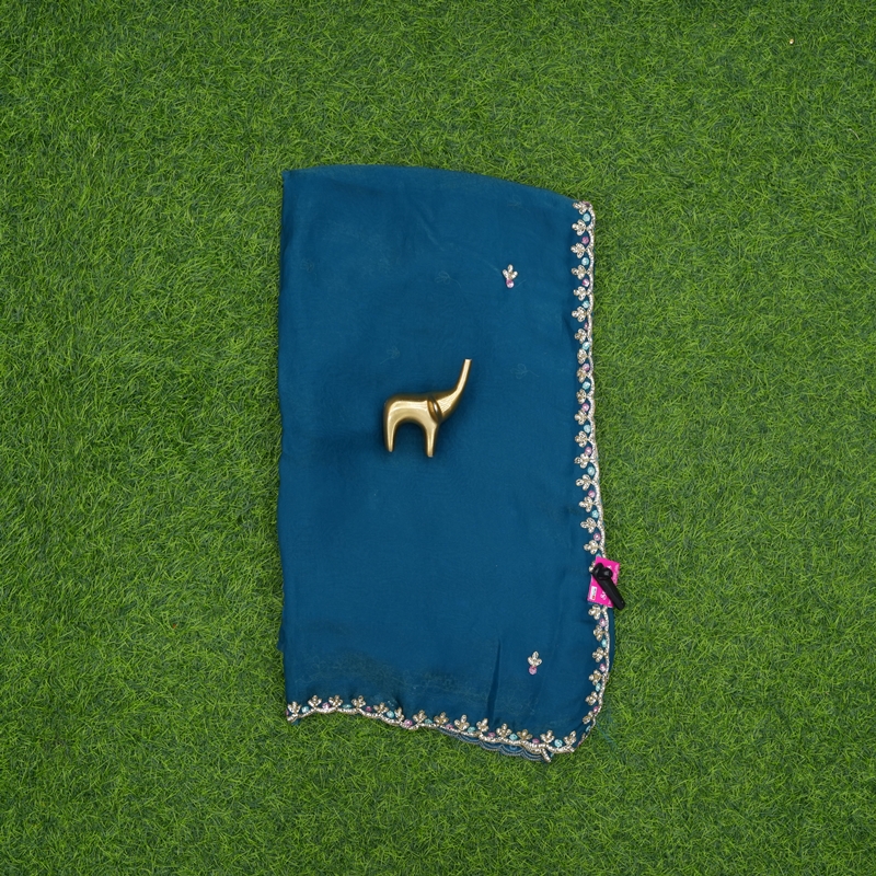 Stand out effortlessly in this Peacock Color  Work Saree featuring intricate buttis and tissue blend material. The subtle sheen of the fabric makes it perfect for weddings and special gatherings.