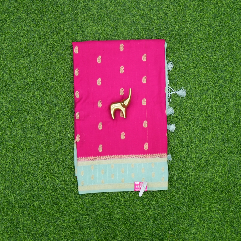 This saree is beautifully designed. The overall design of the saree is fantastic and adorned with a beautiful border, as shown. It comes with a matching designer blouse, which you can customise as per your requirements.