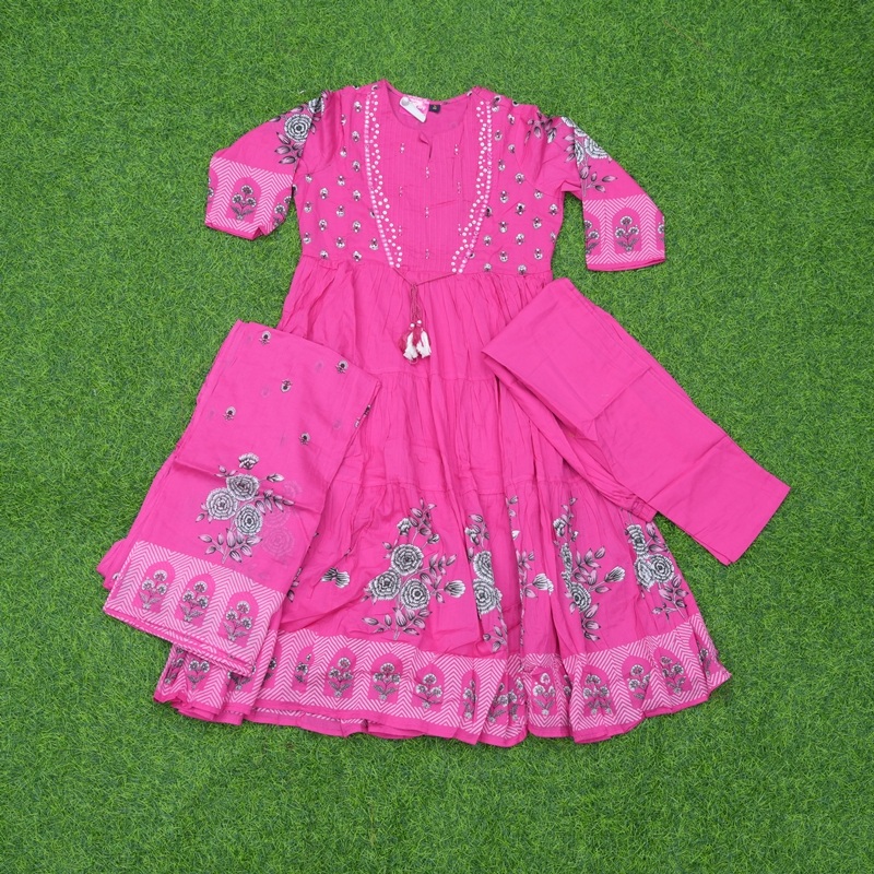 Pink Pure Cotton Anarkali Designer Dress with Embroidered Yoke & Malmal Dupatta