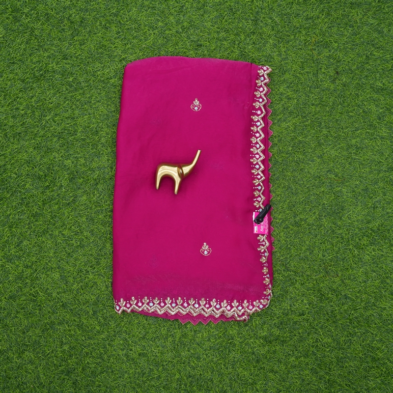 Stand out effortlessly in this Rani Pink Color Work Saree featuring intricate buttis and tissue blend material. The subtle sheen of the fabric makes it perfect for weddings and special gatherings.