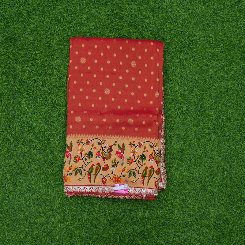 This saree is beautifully designed. The overall design of the saree is fantastic and adorned with a beautiful border, as shown. It comes with a matching designer blouse, which you can customise per your requirements.