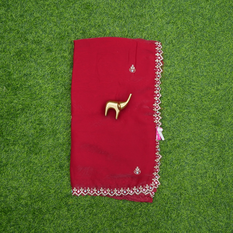 Stand out effortlessly in this Red Color Work Saree featuring intricate buttis and tissue blend material. The subtle sheen of the fabric makes it perfect for weddings and special gatherings.