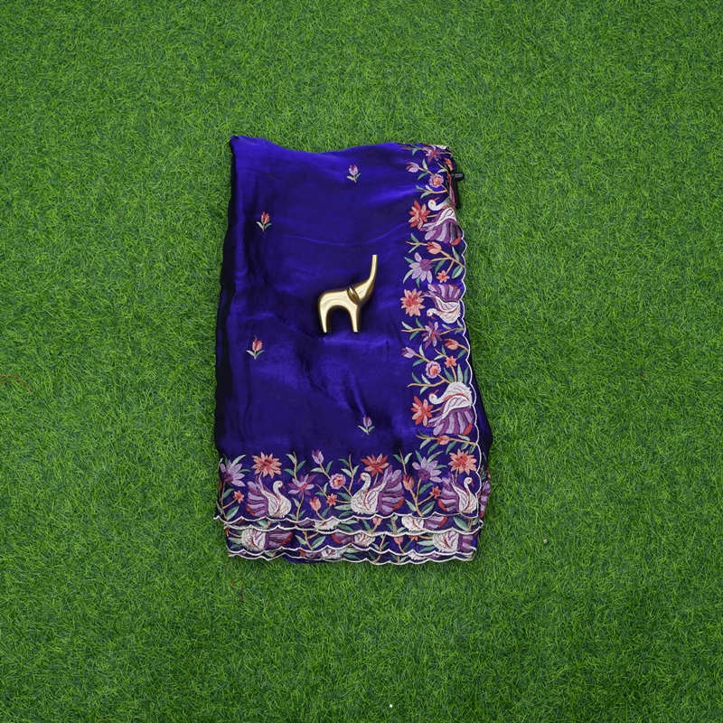 Chat to Buy Royal Blue Tussar Silk Floral Embroidery Designer Work Saree