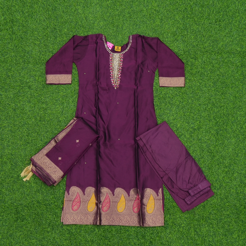 Royal Wine Purple Designer Party Wear Dress with Zari Border & Elegant Embroidered Neckline