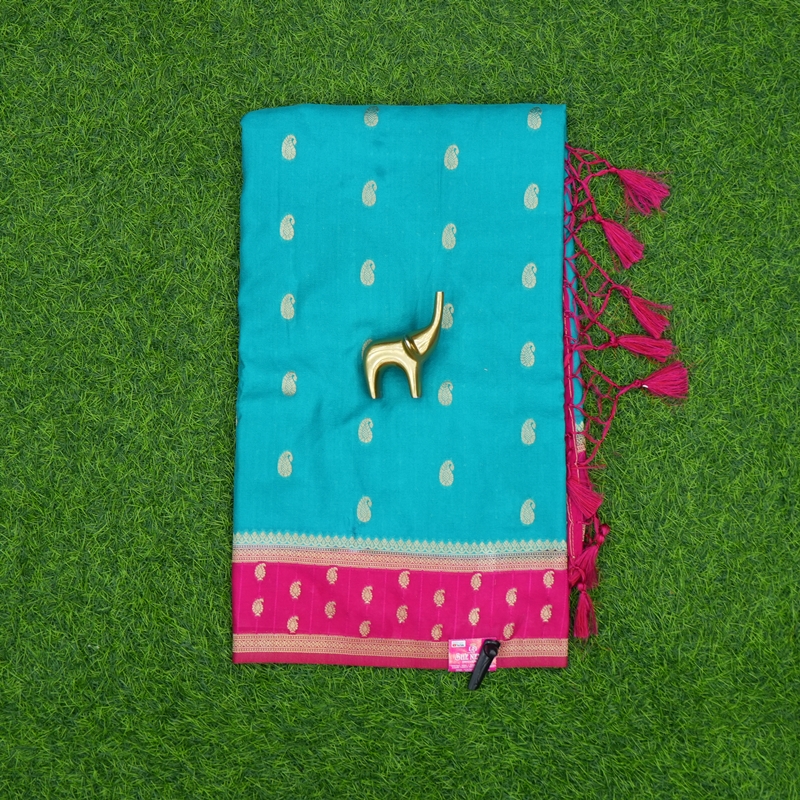 This saree is beautifully designed. The overall design of the saree is fantastic and adorned with a beautiful border, as shown. It comes with a matching designer blouse, which you can customise as per your requirements.