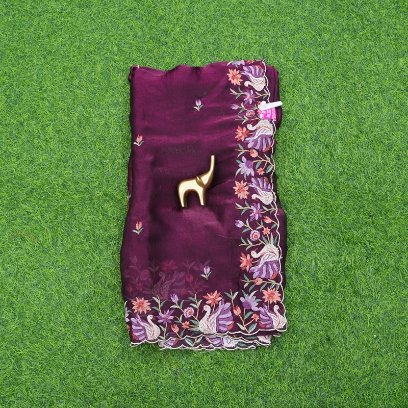Wine Purple Tussar Silk Floral Embroidery Designer Work Saree